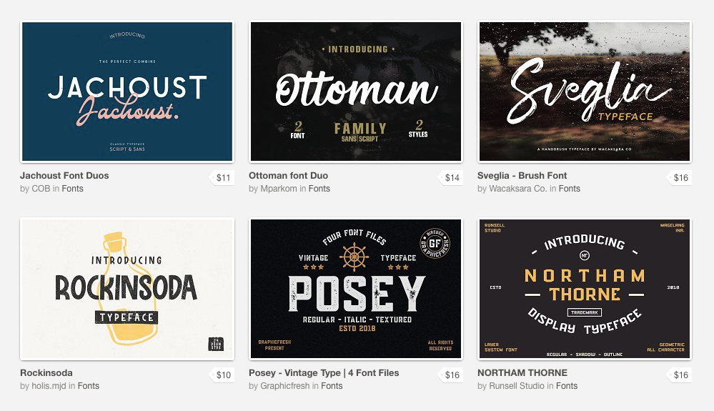 You can also choose display fonts for your logo or for words that you want to pop up on your graphics. Creative Market has an insane amount of beautiful display fonts you can choose from, such as these: