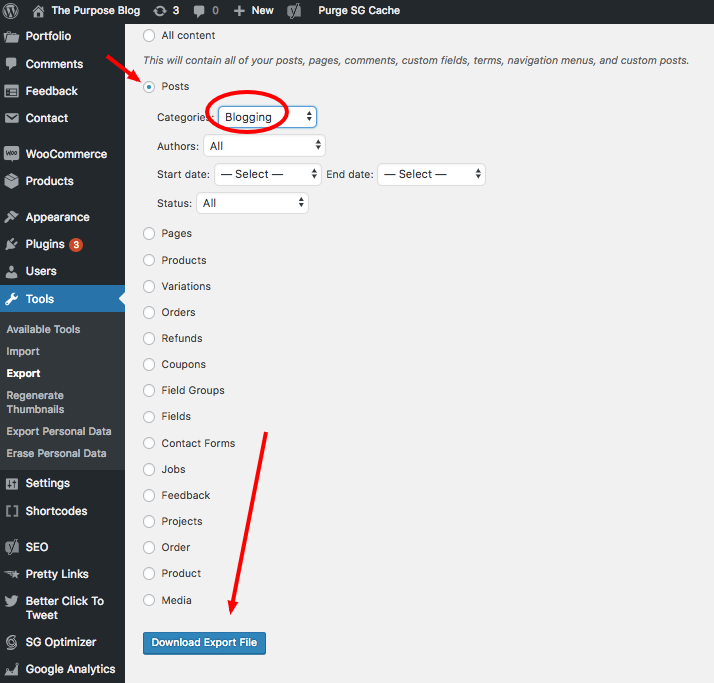 - Using WordPress’ built-in Export functionality (Tools > Export), choose the category to migrate and download the export file.